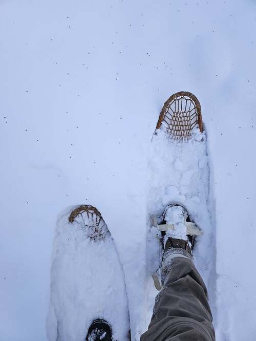 The temperature warmed up to −5° yesterday, so I decided to break in a snowshoe trail. This serves two purposes. First, the snow where I've broken trail will 'set up' and become hard and thereby easier to walk on. Second, the next time we get a big snow dump my trail will still be visible.