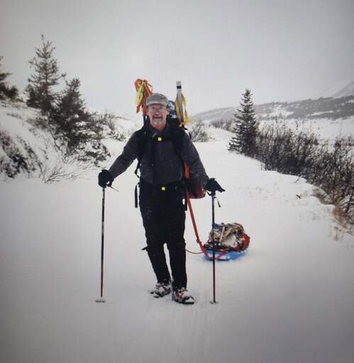 Jon Boone dragging a heavy sled 7 miles into the mountains.